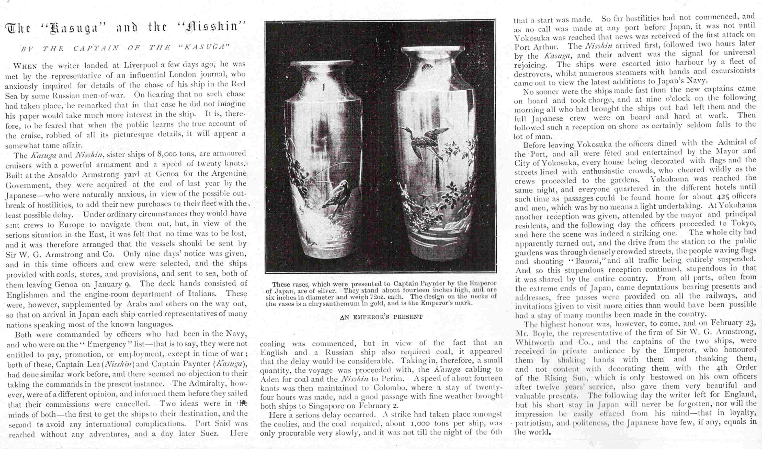 Captain Hugh Haweis Paynter, R.N. was one of very few westerners of his era to personally meet the emperor of Japan. In January 1904, he and Captain J.H. Lea (both "emergency-listed" RN officers whose commissions had been temporarily withdrawn) sailed two Italian-built armoured cruisers and delivered them to the Japanese navy thereupon being renamed the Kasuga and the Nisshin. The voyage of these Japanese vessels with British captains and crews under the imminent threat of war between Japan and Russia, created a huge amount of press interest and speculation, as well as raising political and legal questions (see press cuttings below).